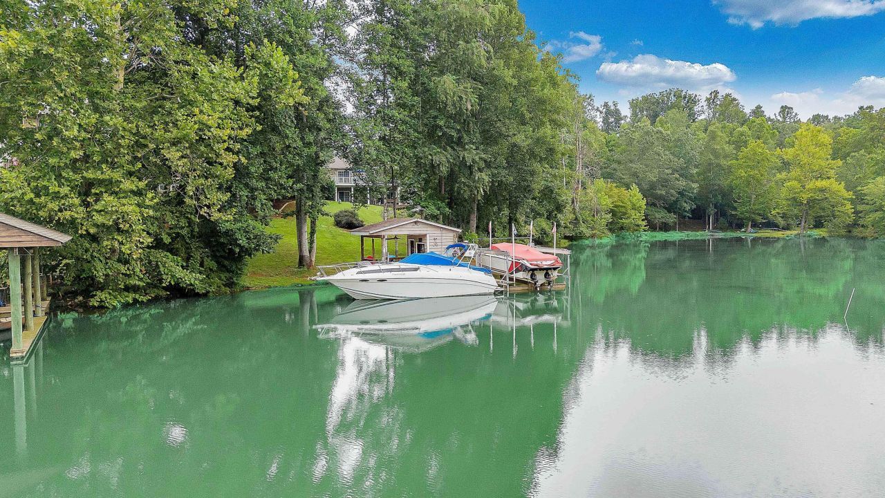 Lake Life is Calling! Custom-built waterfront home in Pirates Cove offers comfort, style & income potential as a short-term rental. Open, light-filled floor plan w/ soaring ceilings, great room w/ gas FP & gourmet kitchen w/ maple cabinets, granite, SS appliances & large island. Main-level suite w/ 2 walk-ins & spa bath + guest suite. Finished lower level adds family room, FP, wet bar, office, BR & full bath. Outdoor living shines w/ composite decking, patios & EASY walk to private dock on good water, 200' shoreline). Cove ideal for swimming, minutes by boat to dining & fun. Features: Roman shower, Jacuzzi, epoxy 3-car garage, 2-zone HVAC, instant hot water, low-maint exterior. Landscaped lot offers privacy yet minutes to shops, dining, SML Airport. Luxury lake living at its BEST!